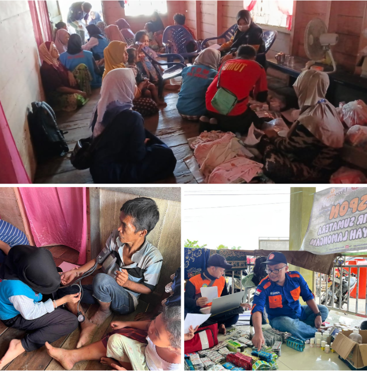 Bantuan yang disalurkan meliputi bahan makanan pokok, pakaian layak pakai, serta roti untuk memenuhi kebutuhan gizi darurat masyarakat. Selain penyaluran bantuan logistik, kegiatan ini juga dilengkapi dengan layanan pengecekan kesehatan gratis bagi warga, sebagai upaya menjaga kondisi kesehatan di tengah keterbatasan pascabencana.