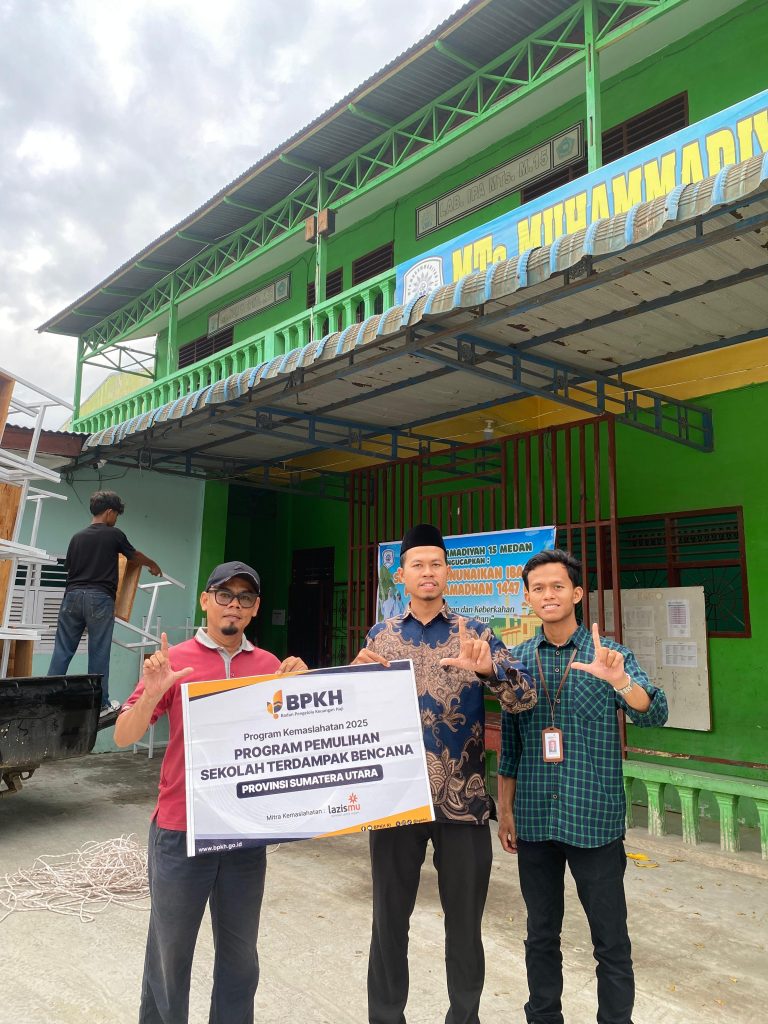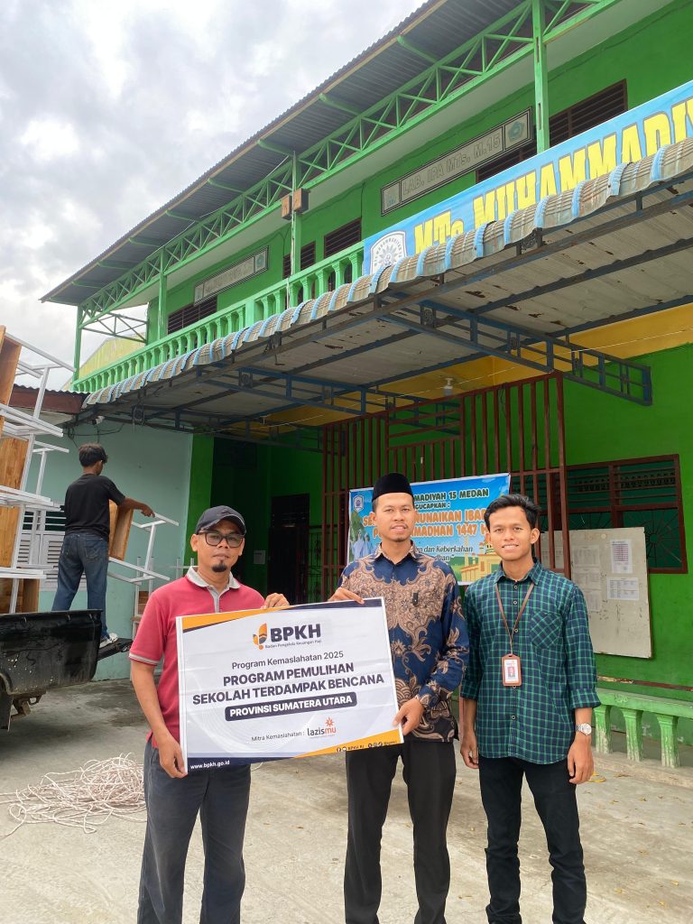 Medan— Badan Pengelola Keuangan Haji Republik Indonesia (BPKH RI) bersama LAZISMU Kota Medan kembali menyalurkan bantuan melalui Program Kemaslahatan berupa Pemulihan Sekolah Terdampak Bencana di Provinsi Sumatera Utara. Kegiatan ini dilaksanakan pada Sabtu, 14 Maret 2026, dengan lokasi penyaluran di MTs Muhammadiyah 15 Medan yang berada di Jl. Alumunium I Gg. Madrasah No.10, Kelurahan Tanjung Mulia, Kecamatan Medan Deli, Kota Medan, Provinsi Sumatera Utara.